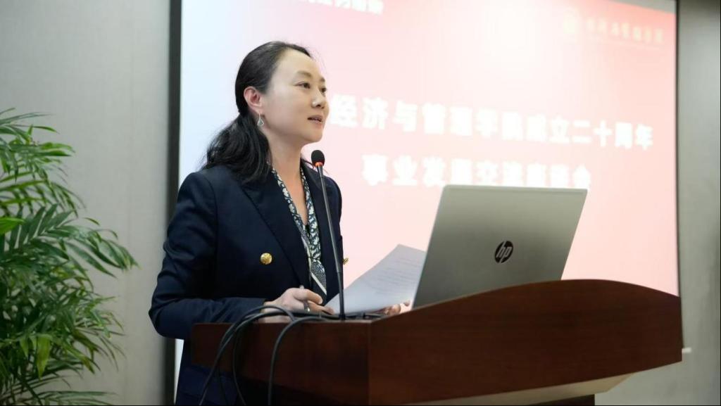 座谈会上,学院执行院长郑景丽向与会代表作学院事业发展情况报告,详细介绍了学院自2004年成立以来的发展轨迹,二十年来在教学、科研、社会服务等领域取得的辉煌成就,并展望了学院未来的发展愿景和努力的方向,希望在历任领导和历届校友的的关心、支持、倾情帮助之下,将学院建设成为立足重庆、面向西南、在全国具有重要影响力的经管学院。