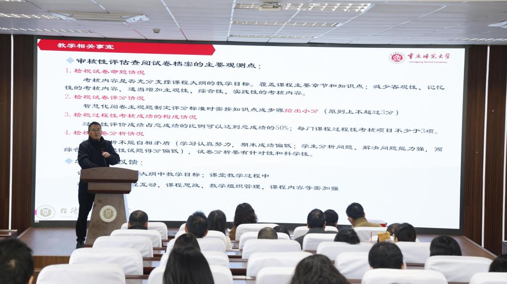 学院副院长段俊针对教学质量提升工作,从审核评估的角度出发,分享了试卷档案管理与实验课程考核等方面的经验做法,并强调了持续优化教学流程、确保各项教育活动合规开展的重要性。